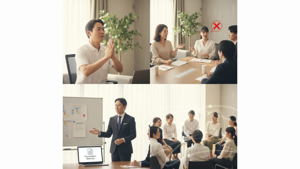 - 発言を求められそうな場面を避ける、相槌だけで会話をやり過ごす