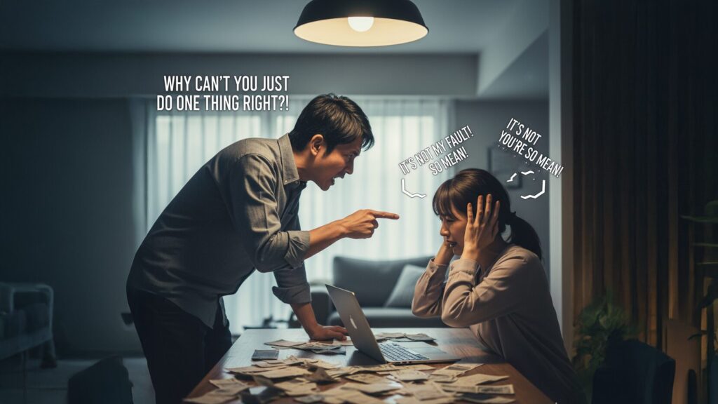 妻の過剰な防衛反応(例:「いつも私のせいにする!もう何もかも嫌だ!」)