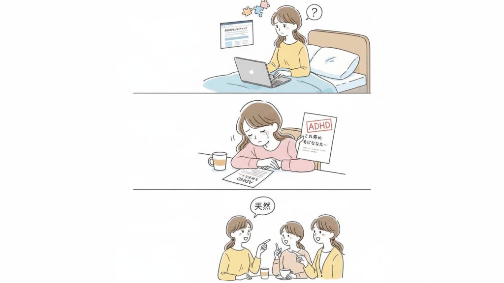 周囲からは「天然だね」「面白いね」と好意的に言われる一方で、本人は失敗の多さや周囲とのズレに深刻に悩み、強い孤独感を抱えている場合があります。このポジティブな評価と自己評価の大きなギャップから、「これは単なる天然という言葉で片付けられる問題ではない。もっと根本的な原因があるはずだ」と考え、ADHDという医学的な説明にたどり着くケースも少なくありません。