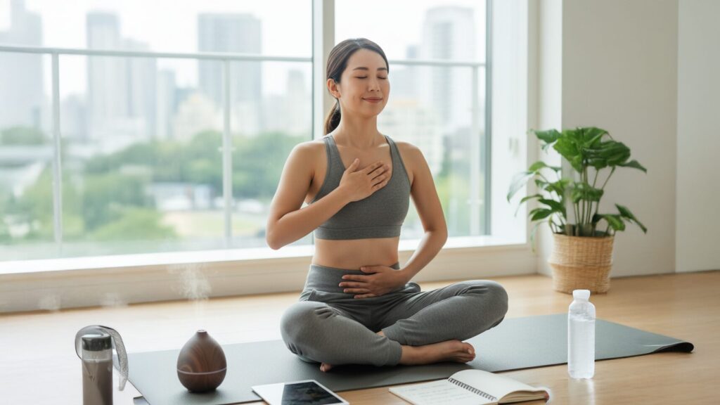 話す前に、ゆっくりと息を吐き出すことに集中する「腹式呼吸」を意識し、副交感神経を優位にしてリラックス状態を作ります。また、話す前や緊張を感じた時に、肩や首、顔の筋肉のストレッチを行い、物理的に筋肉のこわばりをほぐすことも有効です。日頃からヨガや瞑想を取り入れるのも良いでしょう。