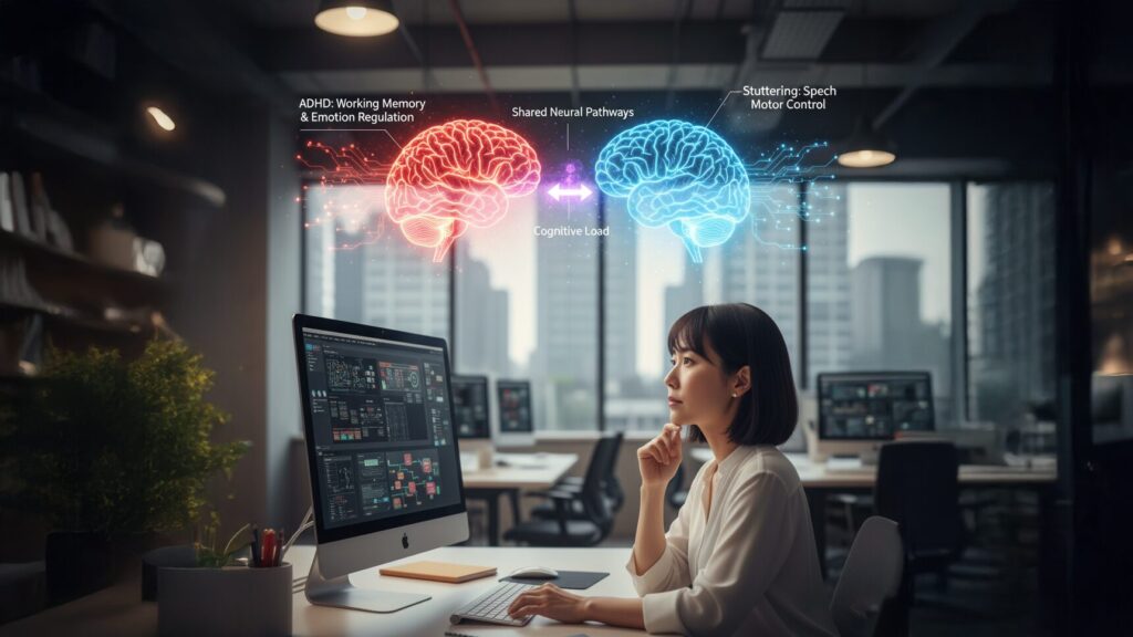 • 脳機能の共通点: 言葉を計画し、発声器官(舌や唇)を適切に動かす運動機能のコントロールや、思考・感情を制御する前頭前野の働きなど、吃音とADHDの特性に関わる脳の領域に共通する基盤があるのではないか、という指摘があります。