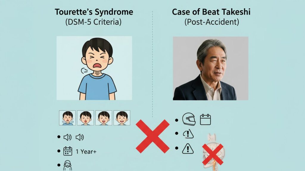 この診断基準の(4)発症が18歳未満、および(5)他の医学的疾患(外傷)によるものではない、という点からも、ビートたけし氏のケース(成人期発症・外傷性)はトゥレット症候群の定義から明確に除外されることがわかります。
