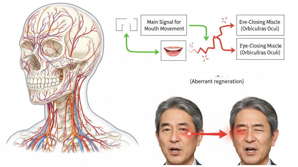 - 結果(症状の出現): この「配線ミス」が物理的に起きてしまうと、脳が「口を動かせ(話せ)」と指令を神経線維Aに送ります。すると、その信号は間違って配線された「目」の筋肉(眼輪筋)にも同時に到達してしまいます。