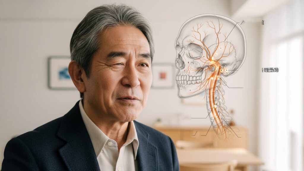 たけしさんのような深刻な頭部外傷(頭蓋骨骨折や脳挫傷)が起きると、このデリケートな神経管が圧迫されたり、神経そのものが引き伸ばされたり、場合によっては断裂したりするリスクが非常に高いそうです。この事故による外傷で、たけしさんの顔の片側(特に右側とされています)に顔面神経麻痺が発症しました。これが、現在の後遺症の直接的な「発症起点」となっています。