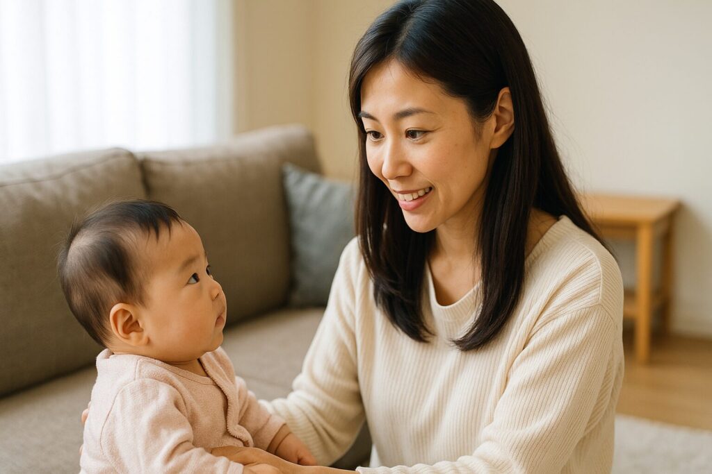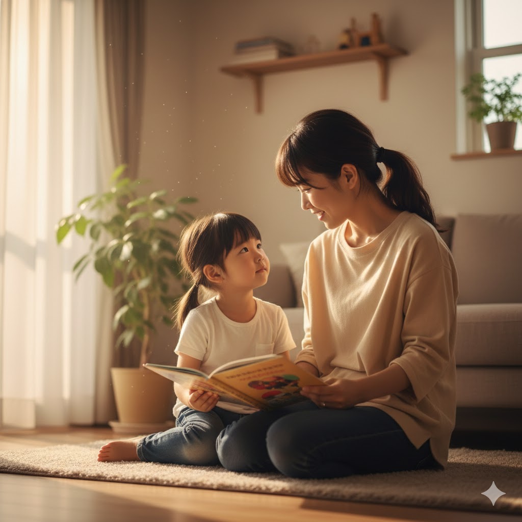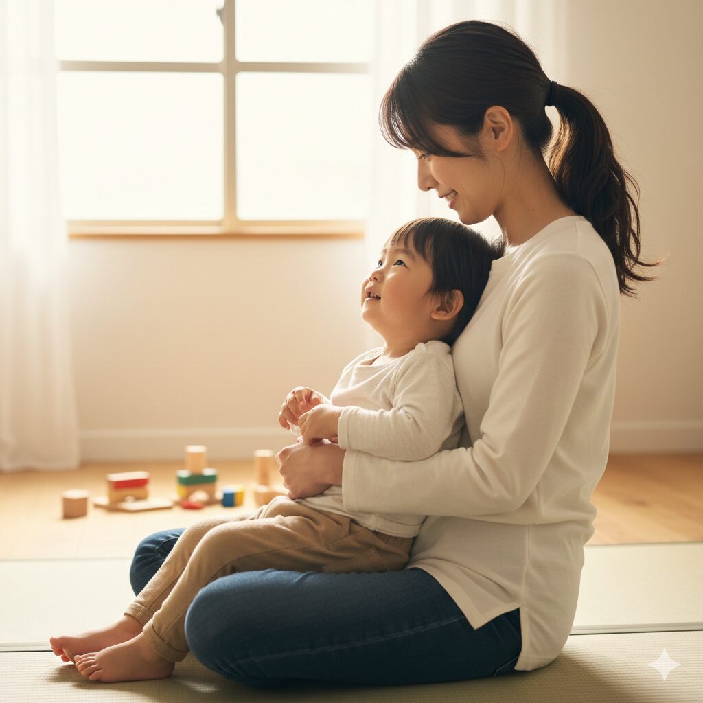 - 高さを合わせる:大人が立ったまま見下ろすと、威圧感がある上に首が疲れます。床に座って(フロアタイム)、お子さんの目線の高さよりも少し低い位置に顔を持っていくことで、自然と目が合いやすい角度を作ることができます。