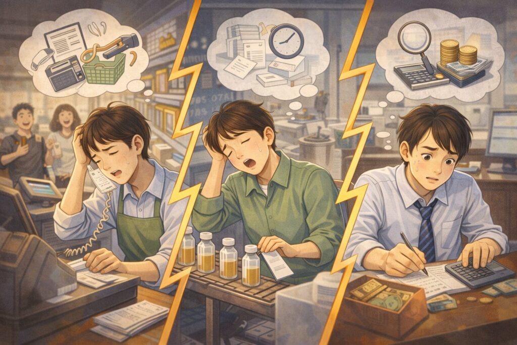 「レジを打ちながら、次のお客さんに声をかけ、横で鳴っている電話に出る」といった状況は、ADHDの脳にとって最も負荷がかかります。パニックになりやすく、どの作業も中途半端になってしまいがちです。