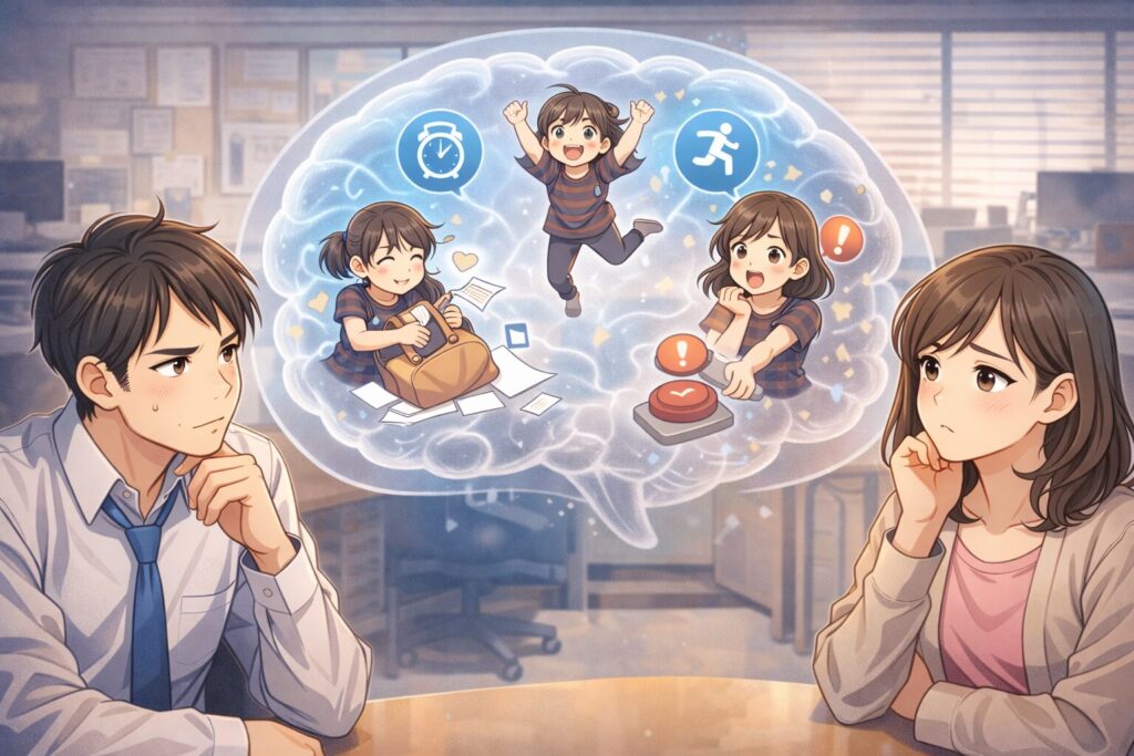 相手のことがうざいと感じたときこそ、一度フィルターを外して「ADHDの特性」そのものを眺めてみましょう。ADHDは「不注意」「多動性」「衝動性」を主症状とする脳の働きの偏りです。これは本人が「気合を入れれば治る」ものではなく、近視の人が自力で視力を回復させるのが難しいのと同じような物理的な状態です。
